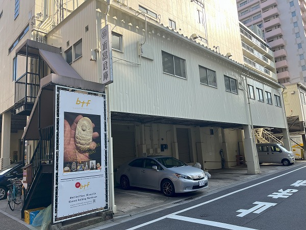 来場者と会話をする齋木さん(右)と、展示会場の@btf がある近富倉庫