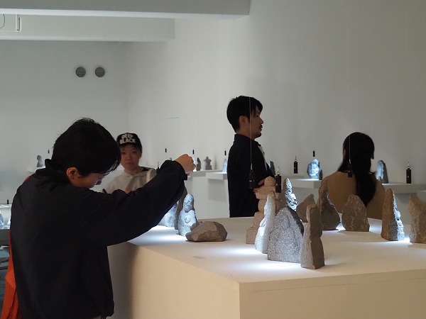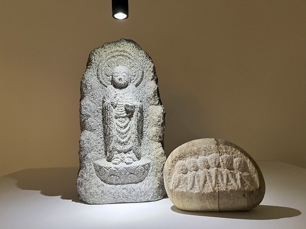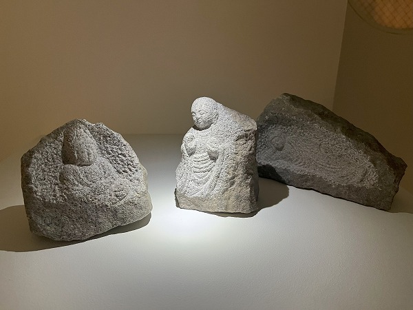 「Little Buddhas」とは、手のひらに収まるほど小さな石仏のこと。今回の展示では、70点以上の作品が並んでいます。会場では、特別に天井から吊るされたペンライトを使って、各作品の表情など細かい部分をじっくり見ることができます。