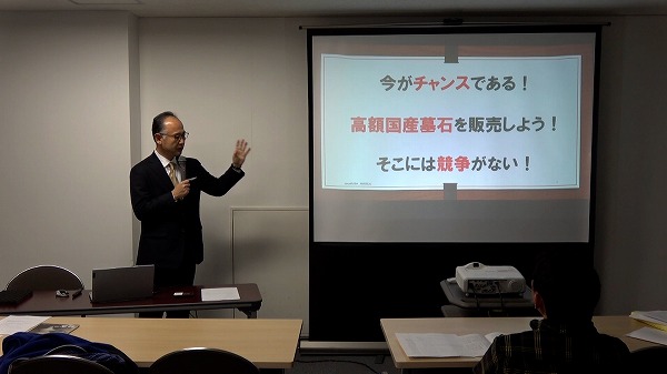 大豆生田社長は、「国産墓石をネットで販売するために必要なこと」「国産墓石を販売するためのネット戦略のイメージ」など、具体的な事例も交えて話をしました。