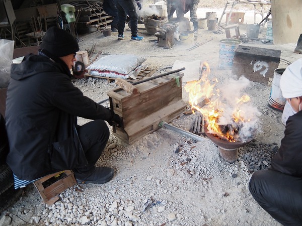 北住さんはふいごを持参し、「明治時代のもの。親方から譲り受けた。年に一回は使っている」といい、講習会では実際に火熾しに使用した。