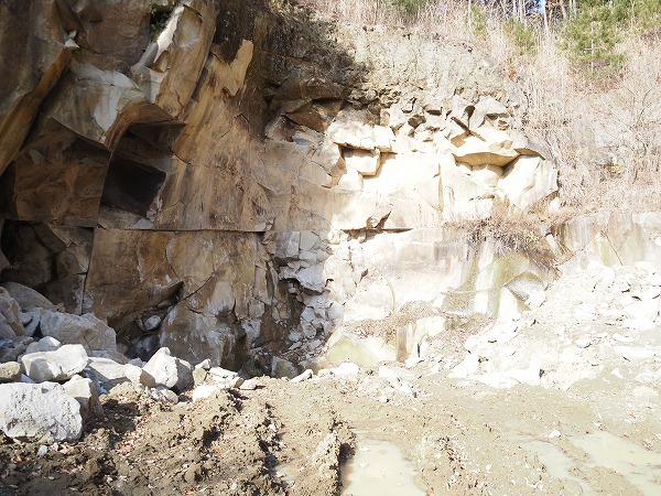 福島県須賀川市にある東北石材石崎商会㈲の江持山作業所(左)と江持石の採掘場