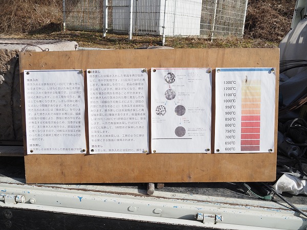 【左】のみの仕上がり具合を確認する参加者【右】焼き入れや焼き戻しなどを説明する看板も用意された