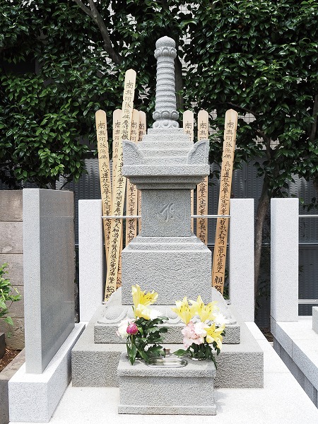 宝篋印塔は、専念寺先代住職の念譽哲哉上人(第24世)に中興号が授与されたことの栄誉を讃え、上人の墓塔として建立されました(心蓮社僧正念譽哲哉上人生阿童庵哲哉大和尚 宝篋印塔)。