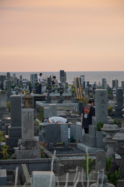 8月15日、陽が暮れると灯籠に灯された火が鮮明になった花見潟墓地。