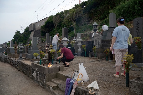 墓前では、13日の「迎え火」の際に供えた盆花を樒(きしみ)に差し替え、お墓を掃除する。そしてお墓の前で火を焚き、ご先祖様を送る。陽が暮れていくにつれ、墓前灯籠に灯された幾つもの火が目立ち始める。幻想的な世界である。