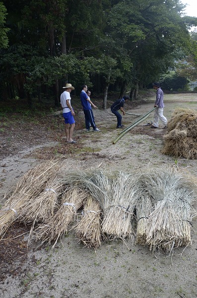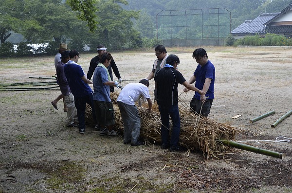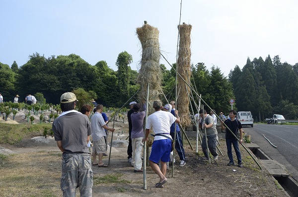 近くの竹やぶから適当な長さの竹を切り出し、それが芯となる。その周りに萱(かや)と藁(わら)を巻くが、それらを用意するのは地区にある家々で、萱は初盆を迎えた家の役目。
