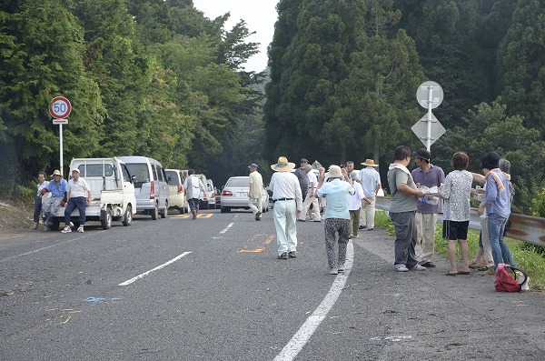 松明を前に、地区住民のすべてとも思われるほどの老若男女が集まった。現在のように「埋め墓」の前で「送り火」をするようになったのは、40年ほど前からのこと。それ以前は初盆を迎えた家々が近くの川に集まり、送り火をしていたという。