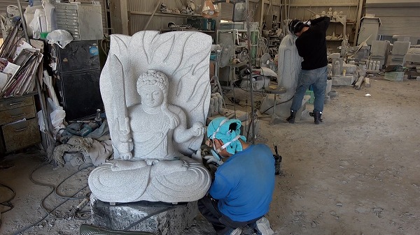 仏像彫刻のようすを一般公開(左、磯貝彫刻)と