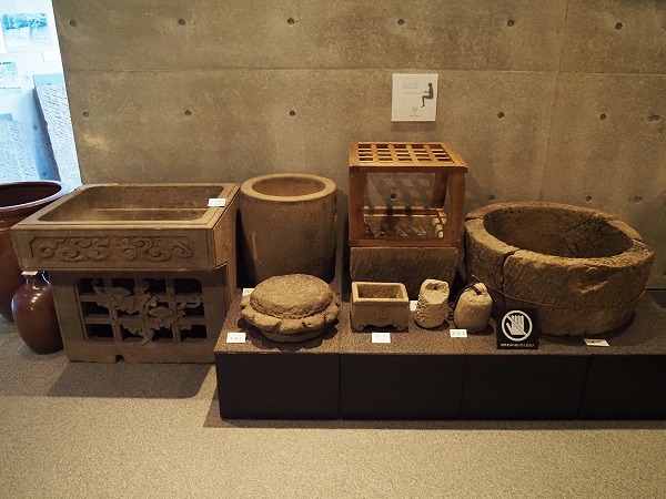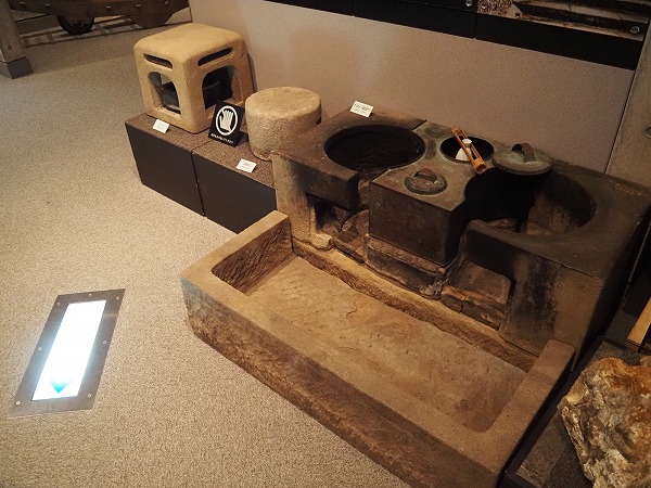 こたつの火床やかまどなど、さまざまな生活用具を来待石でつくった(「モニュメントミュージアム・来待ストーン」にて)