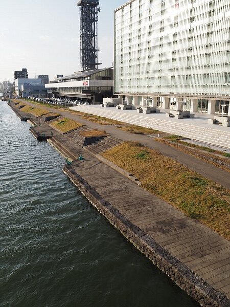 宍道湖と中海をつなぐ川の拡幅工事の際、川べりの遊歩道(敷石・階段石)で来待石が使われた(石垣は島根県産の島石)。上記は松江地方合同庁舎前の遊歩道