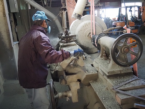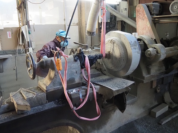 旋盤を使って、出雲石灯ろう(春日)の笠石を加工する(株式会社勝部石材店にて)