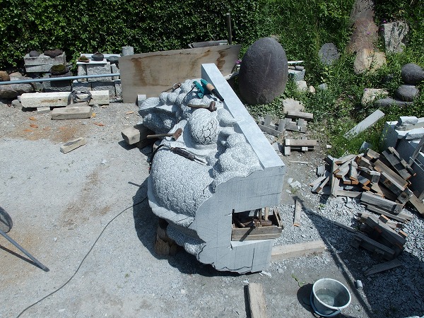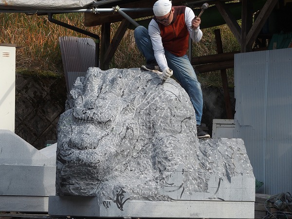 「ノミを叩く体勢がうまくとれなかったり、特に龍の顔の左側の口のなかは、手が入りづらくてたいへんでした。石を倒したり起こしたりは何度もできず、また起こして見ると、倒したときとはイメージが違うことなどもあり、完成までに時間がかかってしまいました」