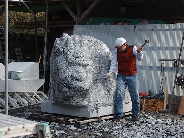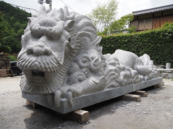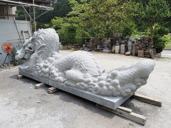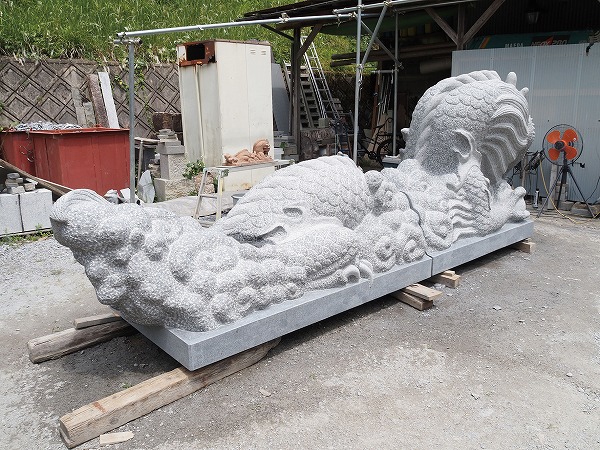 諌本代表は、龍を制作するに当たって苦労した点をこう話す。龍は前後2つの石からなり、全長は4.4メートル(前部2.0メートル、後部2.4メートル)で、高さは1.5メートル、幅は1.1メートル。総重量は7.4トン(前部4.2トン、後部3.2トン)で、台座は本体と1つ石でつくる。その大きさから、イサ工房の作業場で石を動かすことはたいへんな作業だった。