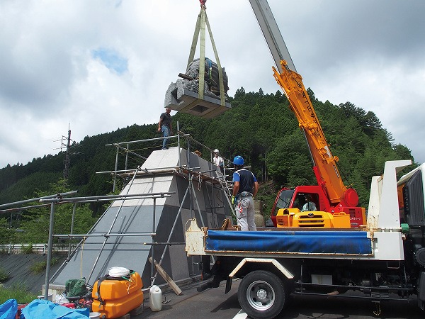 今回使用した石は、予算とその下のモニュメントで使用されている石の色目を考慮して、中国産のG654を選んだ。原石が中国から手元に届いたのは2021年9月末で、できるだけ重量を軽くするために、不要な部分は中国でカットしてから輸入した(カット前の原石の重量は前部9・6トン、後部で6・8トン)。