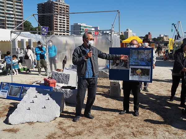 出展業者は下記のとおり(ブース番号順に掲載。写真撮影の際はマスクを外していただきました)。今回は「ふれる&ツナガル」をテーマに、石都岡崎で制作された各種石製品が展示されました。また、石都岡崎の歴史や石造物などもパネル紹介されました。石割体験、親子で楽しめる石に絵や文字を彫るサンドブラスト体験は、今回も大人気でした。