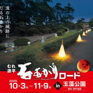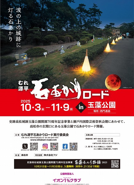 「むれ源平石あかりロード」が10月3日(水)から来月11月9日(日)まで、高松市の史跡高松城跡玉藻公園の西門通路で開催されています。主催はむれ源平石あかりロード実行委員会(岡本俊之実行委員長)。同イベントは庵治産地で毎年開催される夏の風物詩で先月閉会しましたが、今回は史跡高松城跡玉藻公園開園70周年記念事業と瀬戸内国際芸術祭秋会期に合わせて企画されました。