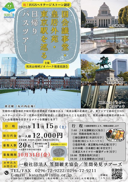 今回のバスツアーでは、笠間市(出発地はJR友部駅と笠間市役所の2ヵ所)を出発し、国会議事堂(衆議院、建物の一部に稲田石を使用)、楠公レストハウスでの昼食を挟んで、皇居外苑(楠木正成像の台座に真壁石を使用)、東京駅丸の内広場(石畳に稲田石を使用)、(車窓より)日本橋・三井本館・日本銀行本店(外壁等に稲田石を使用)、東京スカイツリー展望デッキを見学し、出発地2ヵ所に戻ります。