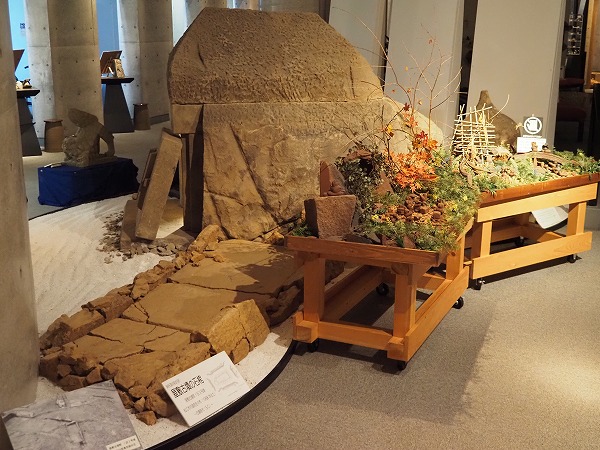 モニュメントミュージアム・来待ストーンでは、来待石の歴史や文化が紹介されています。昭和40年頃まで行なわれていた手掘りの採石風景や灯ろうの加工など貴重な映像も見ることができます。また、島根県内で見つかった化石も多数展示しており、なかでも大森-来待層から発見された「パレオパラドキシア」の下顎化石は世界的に貴重だそうです。