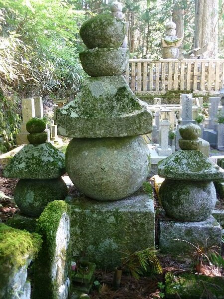 高野山西南院にある噛み合わせ五輪塔。【左から】建長八(1256)年。総高95㎝。3石、寄せ集め。地輪に紀年銘。高野山で確認できる最も古い紀年銘が残る五輪塔。また砂岩製の五輪塔としては「近畿で最古」といわれている。弘安四(1281)年。総高104.8㎝。1石。ア・ビ・ラ・ウン・ケンとあり、胎蔵界の大日如来を刻む。弘安十(1287)年。総高103.2㎝。1石。ア・バ・ラ・カ・キャの五輪塔の発心門を刻む。弘安七(1284)年。総高104㎝。2石。4面に銘文がある。胎蔵界の大日如来をあらわすア・ビ・ラ・ウン・ケンと、水輪の背面に金剛界の大日如来をあらわすバンを刻む。円形座ホゾを持つ。地輪の右側面に光明真言、左側に紀年銘、背面に僧侶18名を刻む。誰のための五輪塔かは不明